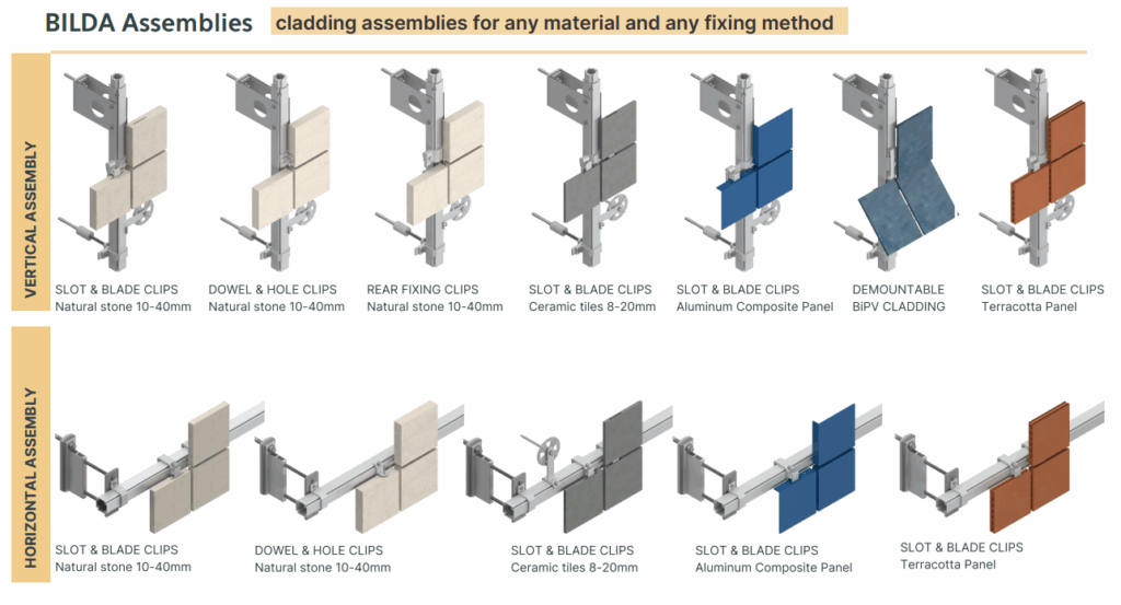 BILDA is a modular subframe that accommodates stone, terracotta, fibre cement, HPL, metal panels, or BiPV – all on the same engineered backbone.